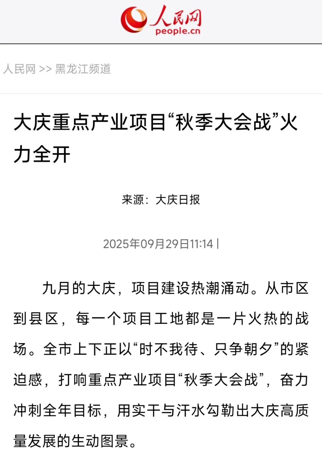 九月的大庆,项目建设热潮涌动。从市区到县区,每一个项目工地都是一片火热的战场。全市上下正以“时不我待、只争朝夕”的紧迫感,打响重点产业项目“秋季大会战”,奋力冲刺全年目标,用实干与汗水勾勒出大庆高质量发展的生动图景。